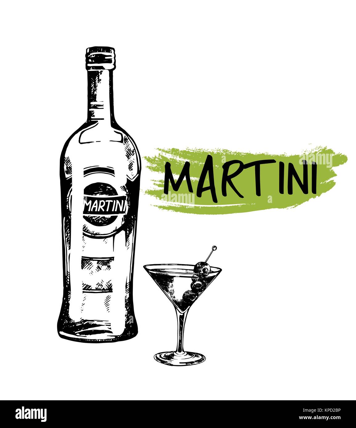 Set Of Hand Drawn Sketch Style Bottle Of Vermouth And Martini