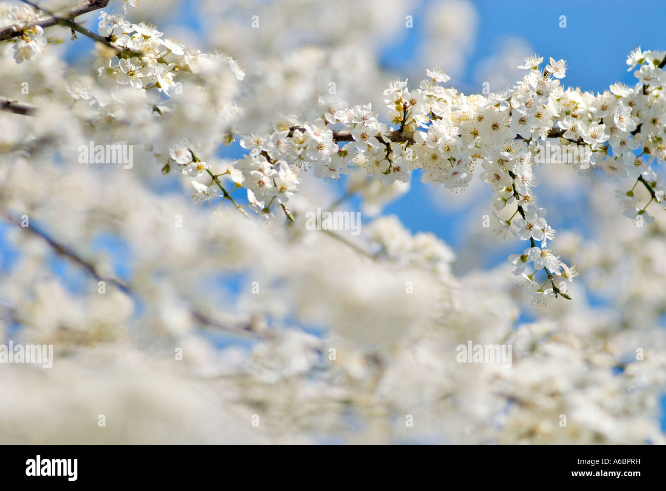 White Bloom On A Branch Of An Ornamental Shrub In Front Of Blue